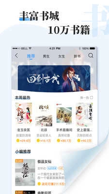 4、进入书城,查看推荐专区中热门的小说,可以切换查看男生女生专区。