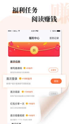提供丰富的阅读任务,每天签到、阅读时长都可以领取金币奖励,一元秒提秒到,新手有福利哦