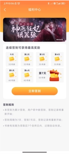 3、在“我的——福利中心”可以进行每日签到领取书券,书券可用于兑换书币购买小说。