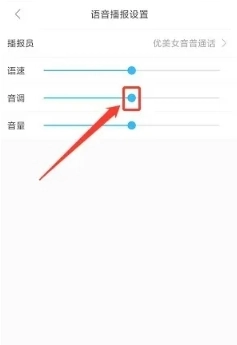 4、进入语音播报设置界面后,找到“音调”设置项,点击其右侧的按钮,即可对播报音调进行设置,具体操作可参考图示。