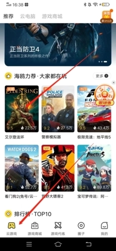 1、并进入后,首先点击左下角“云游戏”,之后再点击想要玩的游戏;