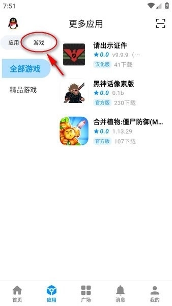 在“更多应用”页面,点击左边的“游戏”,可以切换到游戏专区;