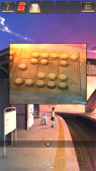 5、往左边走,来到候车厅,找到垃圾箱并查看。按照拼图图案的样子,依次点击上面的圆点,之后垃圾箱就会打开,从中可以获得【钥匙】。