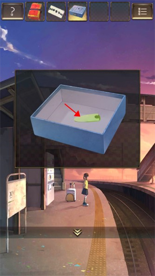 2、向左移动场景来到候车厅,拾取椅子上的【宝箱】,盒子下面获得【纸片】,并获取角落的【扫帚】。