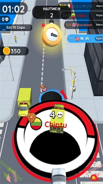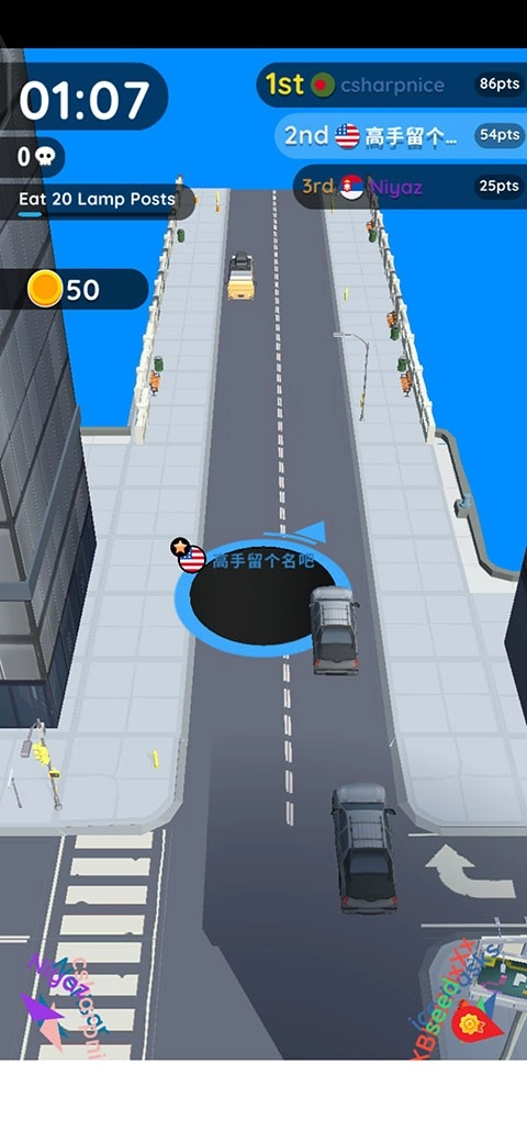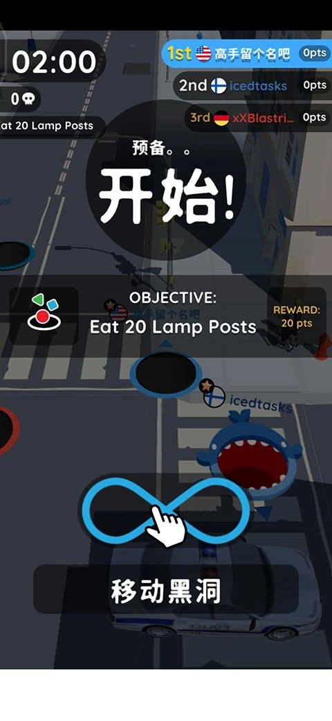 地图里要不断的移动,因为我们可以吃的东西不会突然出现,你要去寻找,沿着道路,发现可以吃的东西,快速过去,完成吞食的动作,增加我们的黑洞的体积。