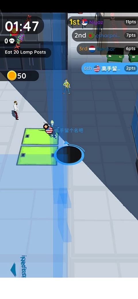 5、在游戏刚开始的时候,我们可以选择小一点的目标进行吞噬,例如人、垃圾桶、下水道井盖等小物品。