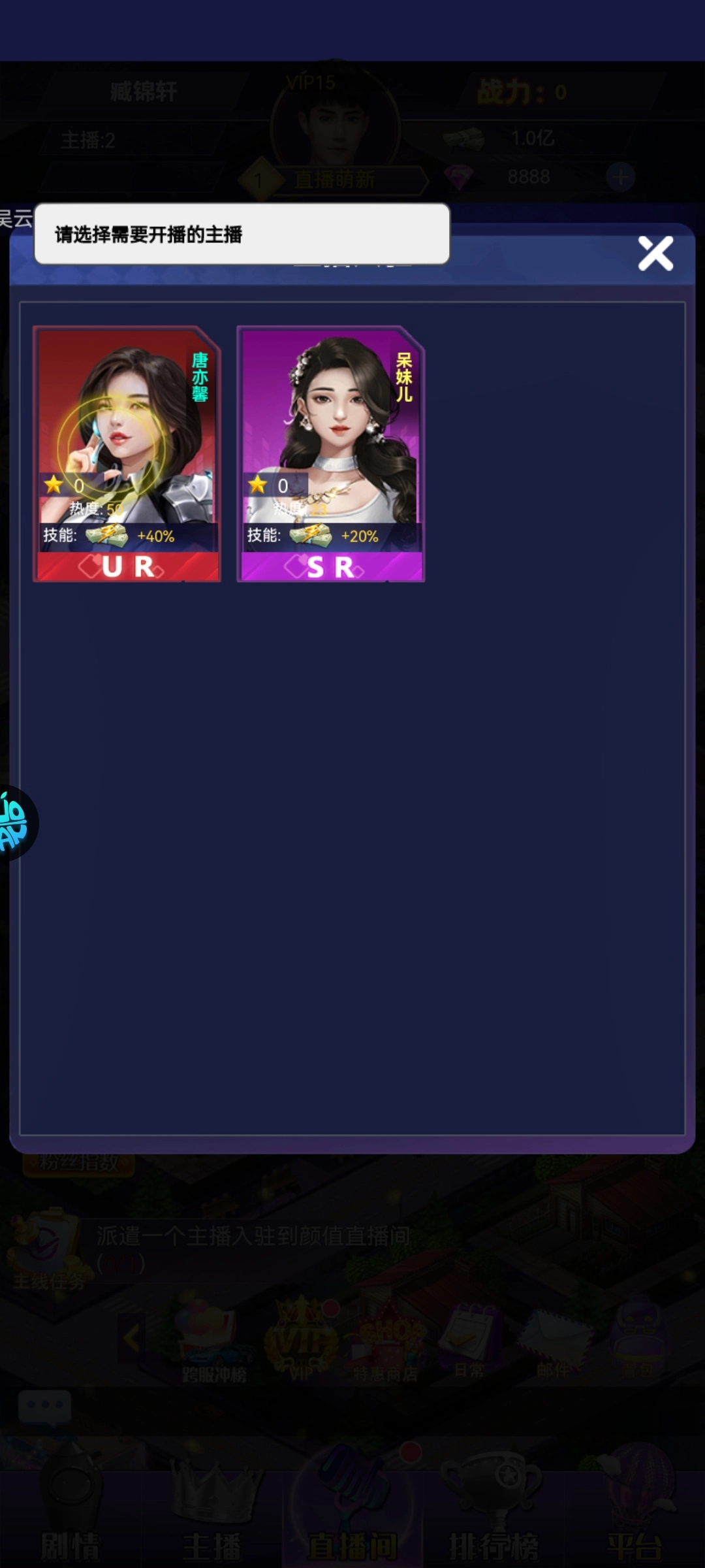 7、选择技能高一点的主播上场即可