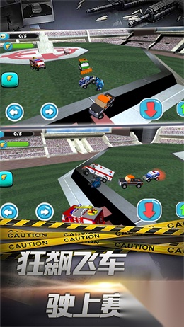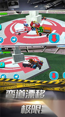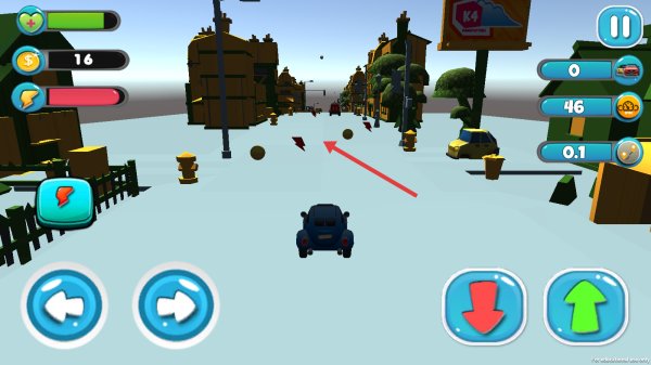 3、在街道场景,控车吃道具、避障碍,按箭头方向冲刺,完成竞速。