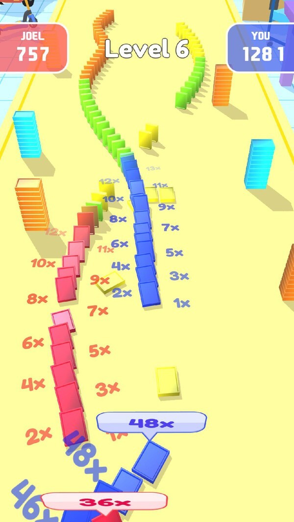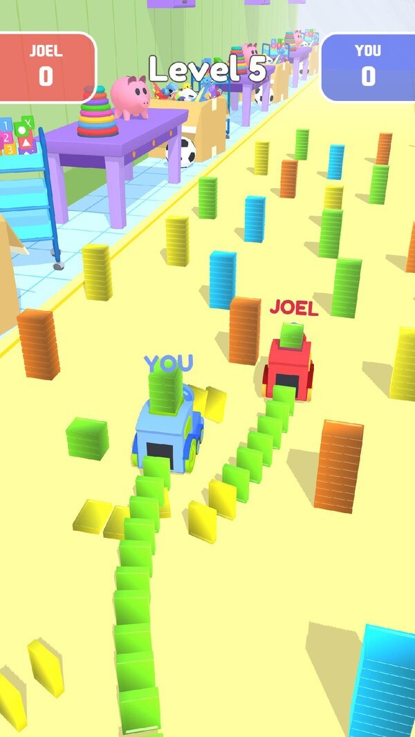 驾驶着咱们的小火车,持续铺设更多不同颜色的多米诺骨牌。