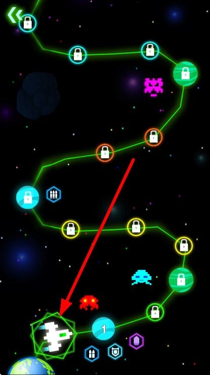 2、关卡地图中,选择箭头指向的解锁飞船,进入对应太空战斗场景,准备迎战外星敌人。