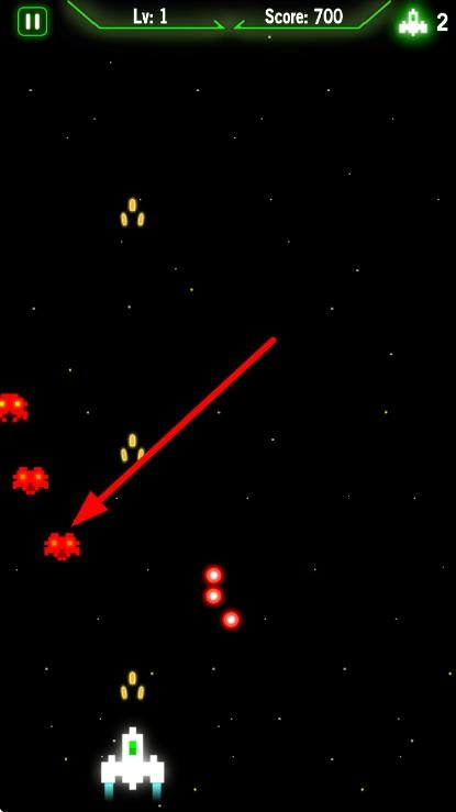 3、战斗时操控飞船移动躲避子弹,瞄准箭头指向的红色敌人,射击消灭,获取分数。