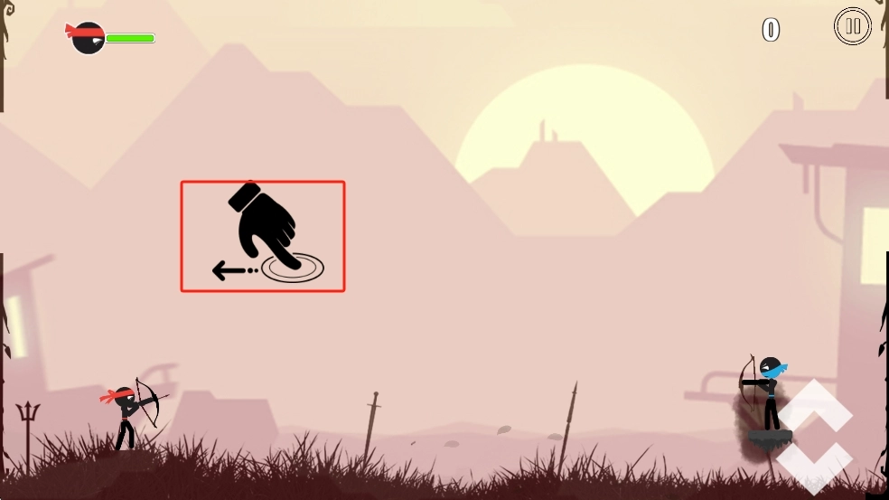 1、长按左侧红巾弓箭手附近区域,向左滑动蓄力,瞄准右侧蓝巾敌人,松开手指发射箭矢,开启战斗。