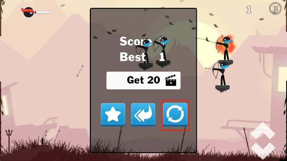 3、若战斗失败,点击界面右侧蓝色圆形重玩按钮,重新挑战关卡,优化射击策略,提升命中率击败敌人。