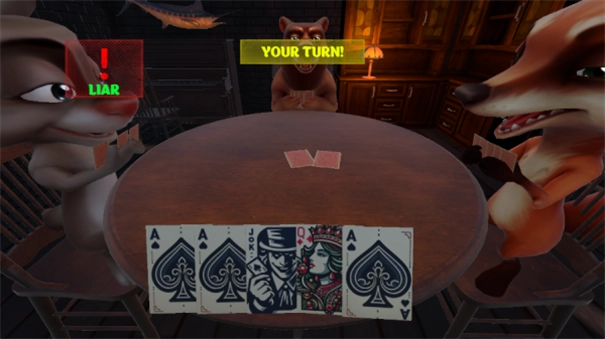 3、在扑克牌模式中,玩家依次出牌,并报出所出牌面的数值,该数值需与桌面上的要求相符。出牌过程中,玩家有可能虚报牌面数值。若其他玩家对此存疑,可予以揭穿。一旦有人被揭穿且证实说谎,就必须拿起桌前的左轮手枪进行一轮俄罗斯转盘游戏,枪内仅有一发子弹。若能幸存,便可继续参与游戏;若不幸“中招”,则游戏宣告结束。一轮转盘结束后,牌局重新开始。