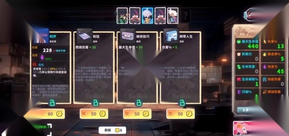 音乐家的攻击会附带各式各样的特效,像持续伤害、减速、弹射、击退、冻结、感电、暴击、斩杀等,数十种信物与上百种道具相搭配,再结合英雄与音乐家,能组合出千变万化的战斗流派。