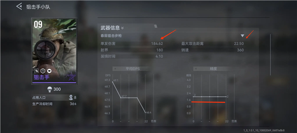 4、对比突击队的详细说明,这里我简单介绍下狙击手。其兵卡界面显示伤害为35,这仅代表综合输出能力,毕竟他只有一个兵员。实际输出方面,从详情界面可知,武器春田狙击枪单发伤害达184(多数步兵1单位血量仅140左右),精度为2且不衰减,穿甲2,攻击范围22.5 。