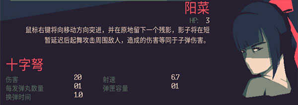 三、阳菜 生命值(HP):3。使用鼠标右键时,角色会朝着移动方向快速突进,同时在起始位置留下一个残影。这个残影会在经过短暂的延迟后,以起舞的动作攻击周围的敌人,所造成的伤害与子弹伤害数值相等。