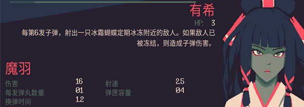 七、有希 生命值(HP):3 ,每发射第6发子弹时,会射出一只冰霜蝴蝶,该蝴蝶会定期冰冻附近的敌人。若敌人已处于被冻结状态,则会造成子弹伤害。