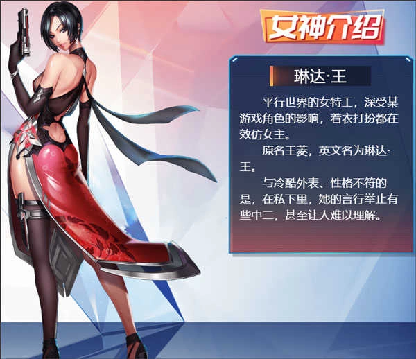 在平行世界中,有一位女特工,她深受某游戏角色的影响,无论是穿着还是打扮,都在刻意模仿游戏女主。她本名王菱,英文名是琳达·王。令人意想不到的是,与她那冷酷的外表和性格形成鲜明反差的是,私下里她的言行举止透着一股浓浓的中二气息,有时甚至让人摸不着头脑。