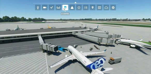 在页面的右上角,设有飞行设置选项,其中涵盖天气设定、联线飞行功能以及由AI操控的其它航班相关设置。