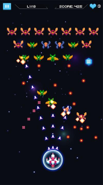 《太空侵略小蜜蜂》是一款充满刺激与精彩的飞行射击闯关游戏。它采用简洁的像素画面风格,以俯视角展开游戏场景。在游戏里,玩家将操控飞行器迎接挑战,能在各式各样丰富的关卡中开启飞行之旅。面对密集的弹幕,玩家必须凭借灵活的走位,才能成功消灭敌人,顺利完成闯关。