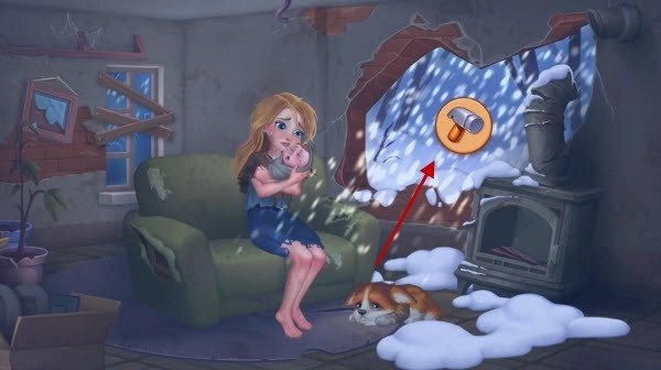 2、主角一开始会身处一个破旧的房子里,得把各类漏洞修补好,以助其生存下去。点击锤子图标。
