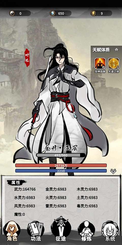 6、角色界面会显示你全部的角色信息,包括天赋体质和各项属性的详细数值。
