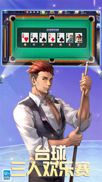 游戏规则如下:准备一副完整的54张扑克牌,其中A至K依次对应1至13号球,小王对应14号球,大王对应15号球。系统会为每位玩家随机抽取7张牌。抽牌结束后,玩家依据手中抽到的牌所对应的球号进行击球,需注意8号球同样属于普通目标球。在三位玩家中,率先将目标球击入袋中的玩家获胜。