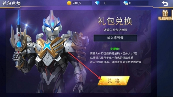 2. 进入礼包兑换界面,在相应位置输入礼包兑换码,随后点击【兑换】按钮,即可获取礼包。