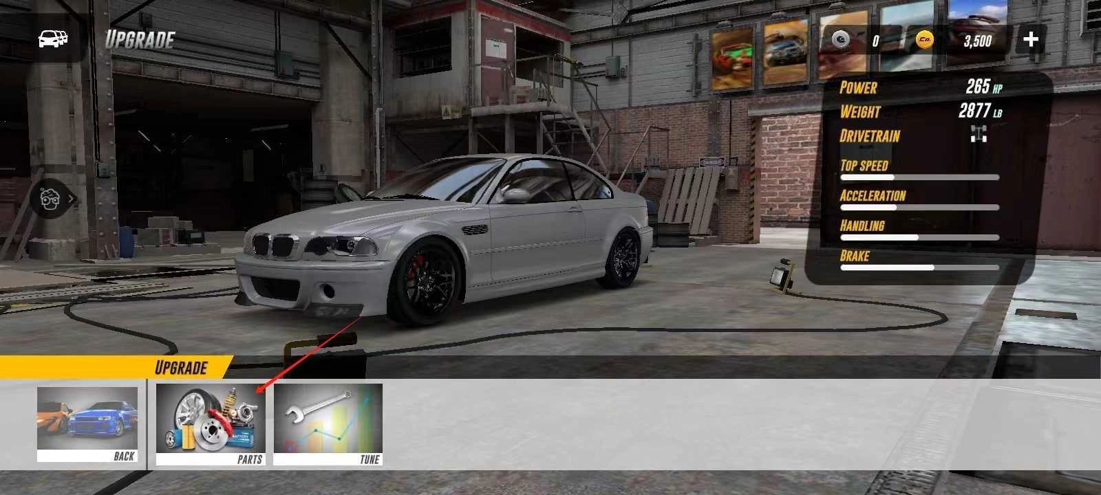 10、最后一项任务是为汽车安装升级版。操作步骤为:点击车库,接着点击【UPGRADE】,再点击【PARTS】,在此处就能购买你想用于升级的零件。