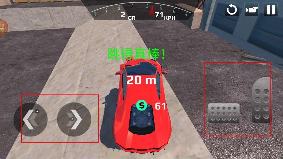 驾驶跑车时,点击右侧的油门按钮就能让车速提升,而左侧的方向按钮则可以控制跑车进行左右转向,通过灵活操作这些按钮,就能操控车辆顺利行驶。