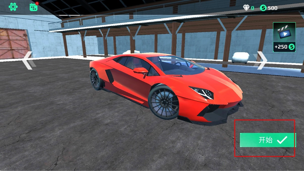 进入游戏后,看到红色超级跑车的展示画面,点击右下角的开始按钮,就能开启跑车驾驶体验,进入模式选择环节。