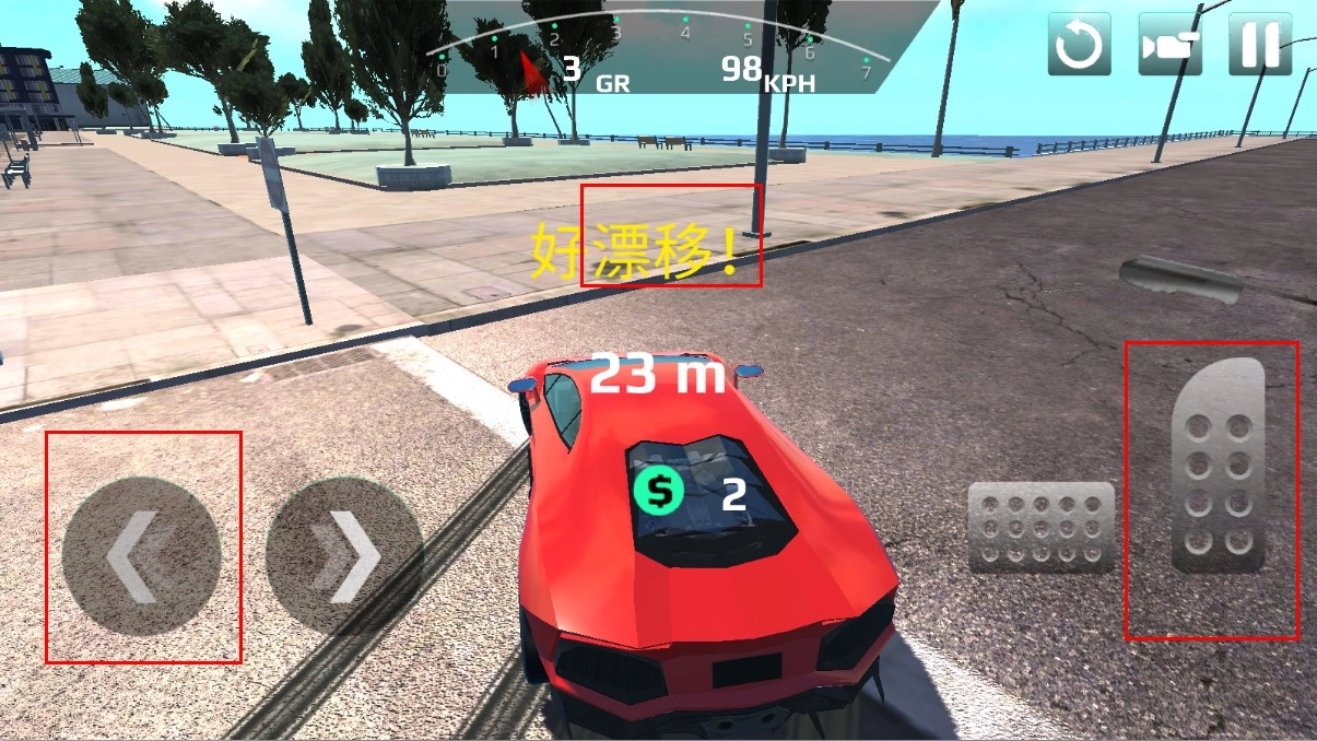 在合适的弯道位置,配合方向与油门的操作,能够让跑车完成漂移动作;成功漂移时会出现“好漂移”的提示,并且可以获得金币奖励。