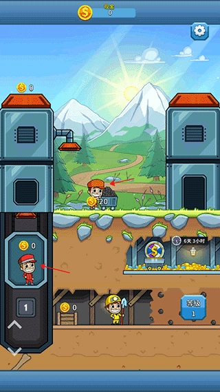 首先按照新手指引,点击地下矿里穿黄色衣服的矿工,他就会开始挖矿;等矿石挖好后,他会把矿石背到左边靠近电梯的小箱子里。这时点击电梯里穿红色衣服的矿工,他会把箱子里的矿石传送到上方的机器中。接着点击地面上推小车的红衣服矿工,他会推着小车到机器下方接住金币,再送回原来的位置。这三个矿工的工作规律很清晰:地下穿黄色衣服的矿工可以持续挖矿,电梯里的矿工只需负责把挖好的矿石往上运送,地面上的矿工则在机器下接住矿石、推回原地就能获取金币。