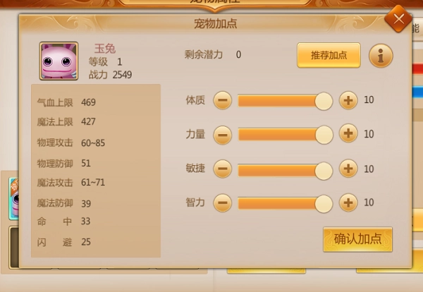 宠物升级时会得到潜力点,这些潜力点能够由玩家手动分配到宠物的各项基础属性上。
