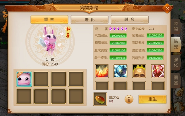 使用魄之石让宠物重生后,宠物的强化效果和属性都会被清除。