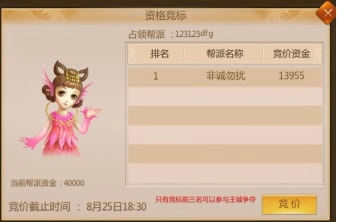 非王城争夺时段,各帮派的帮主与副帮主可参与王城争夺资格的竞标。本周六晚19点30分是竞标截止的最后时间,届时竞价最高的前三名帮派将取得王城争夺资格,成为攻城方。另外,上一周占据王城的帮派则作为守城方。