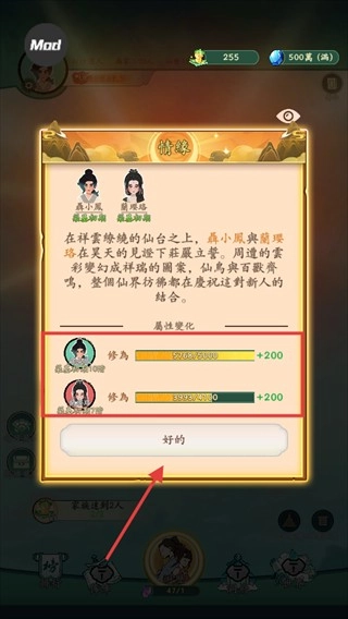 情缘后点击【好的】确认,双方修为各加200,完成流程后可继续探索修仙世界。