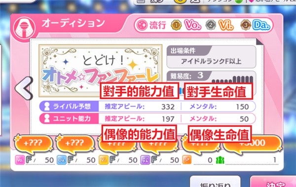 在选择参加那个试镜的界面,能看到对方和自己的各项能力值。要是察觉对方的能力值或者生命值远远超过自己,你或许就该去培养一下偶像,或者挑选难度更低的试镜了。