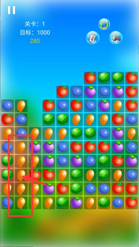 2、眼睛盯着屏幕,找出相同的水果,只要有三个或三个以上连在一起就可以点击消除,消除的数量越多,分数增长的速度就越快,当分数达到目标时就能顺利过关。