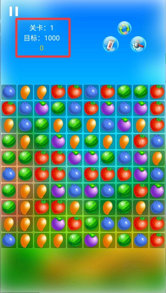 1、启动游戏后直接点击开始按钮,选定难度即可进入游戏场景,每一关需要消除的水果类型与数量都各不相同。