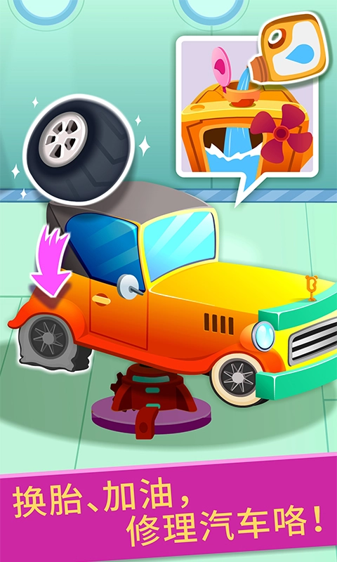 扫描完汽车故障,就可以着手维修啦!先打开汽车引擎盖,把相同颜色的电线连接妥当,接着添加机油、玻璃水之类的液体,在修理过程中还能进一步熟悉汽车的内部构造。要是小天使的车突然爆胎了,该怎么修理呢?宝宝快来大显身手吧。