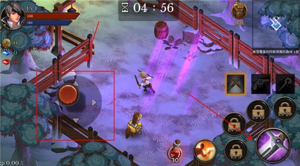 3、操作方式采用经典设计,左侧摇杆负责操控角色移动,右侧则设置了技能按键与普通攻击按键。