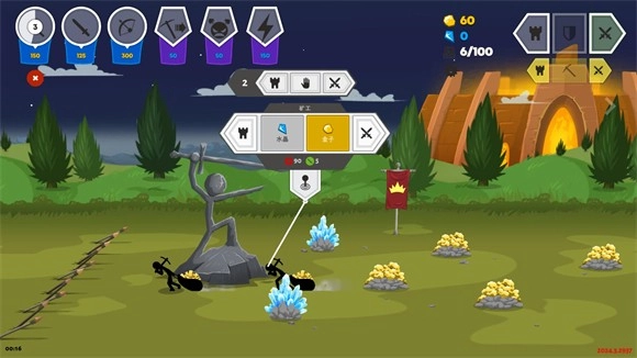 3、经观察发现,敌方士兵和矿工的行动策略以防守为主,主动进攻的情况较为少见。我们可以利用这一特点,快速扩充工人数量以提升资源获取效率,同时合理运用各类道具,为后续发起进攻做好准备。
