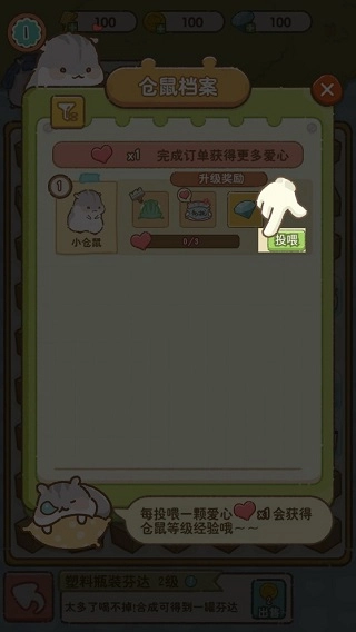 完成任务所获得的爱心是至关重要的道具。你能够将爱心投喂给小仓鼠,小仓鼠得到爱心后会为你回馈十点经验。要是想快速升级,就得多合成爱心并进行投喂。