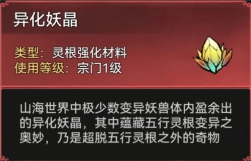 异化妖晶:三阶及以上的矿石采集与林植采集活动中可产出该物品,其用途为洗灵根玩法里的“变异密藏”系统。