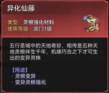 异化仙藤:弟子可在讨伐异兽或探寻宝地时以一定概率获取此物,其主要用于弟子灵根的变异与强化,能显著增强弟子的战斗能力。