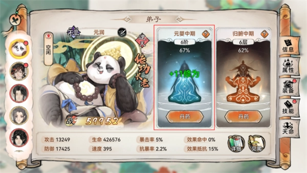 弟子升级时,属性面板里的根骨和资质是关键,得格外留意。根骨数值越高,炼体的进度就会越快;而资质越好,服用丹药后修为的提升速度也会更显著,这样能避免丹药的浪费。