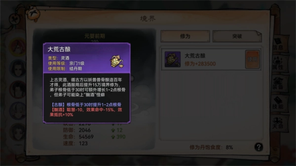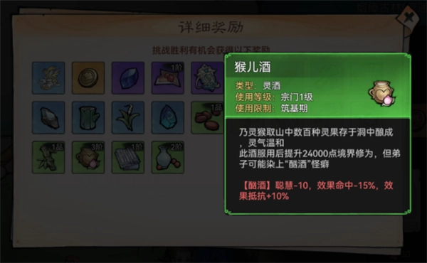 例如:山中灵猴取山中数百种灵果存于洞中酿成的【猴儿酒】,灵气温和,服用后可提升大量境界修为。