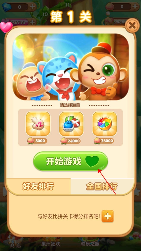挑选关卡,点击“开始游戏”按钮,每一次启动游戏都会消耗一颗爱心。